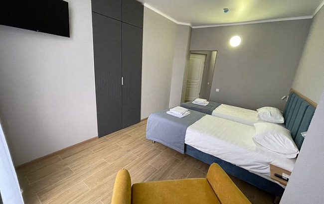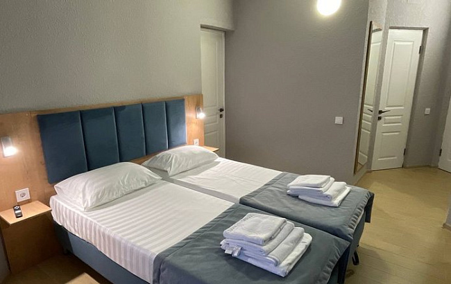 В номере: две односпальные кровати, кондиционер, телевизор, мини-холодильник, санузел с душем, балкон. Номера расположены на 5 этаже.
