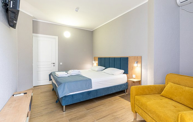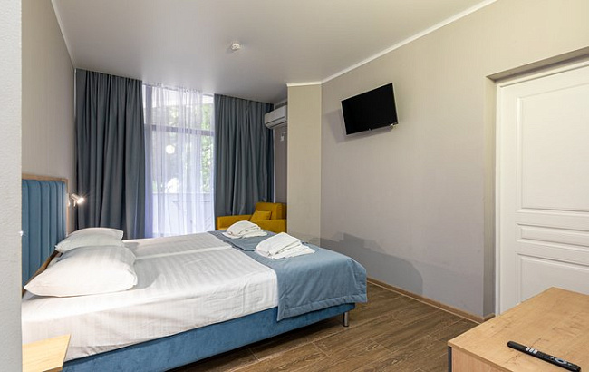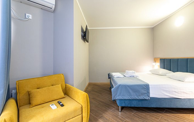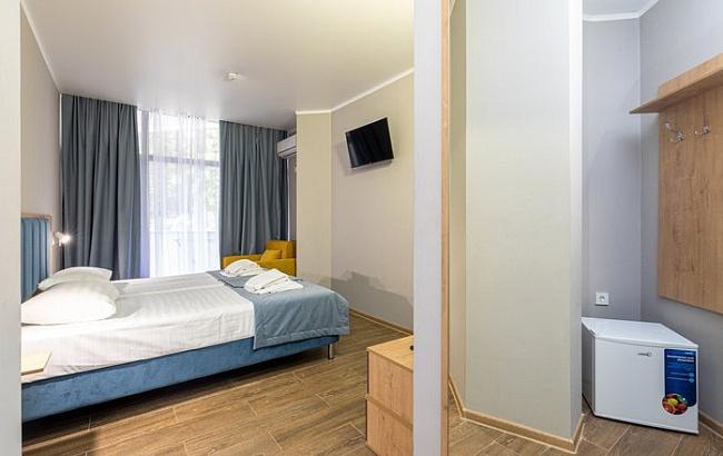В номере: двуспальная или две односпальные кровати, кресло-кровать, кондиционер, телевизор, мини-холодильник, санузел с душем, балкон.